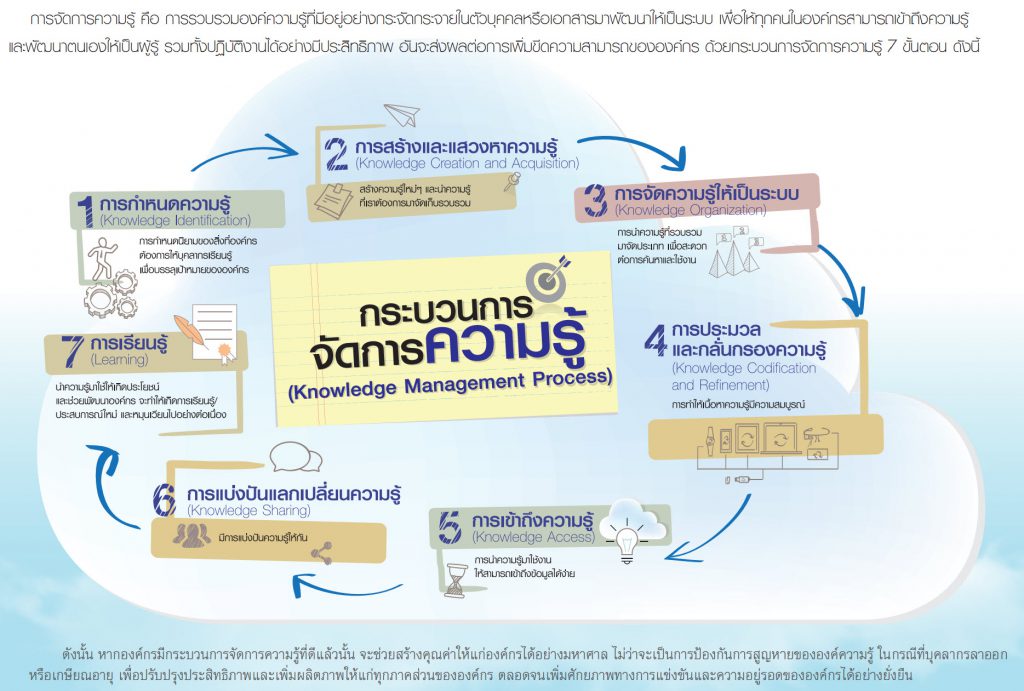 เป็นการสร้าง แสวงหา รวบรวมความรู้ทั้งภายใน/ภายนอก รักษาความรู้เดิม แยกความรู้ที่ใช้ไม่ได้แล้วออกไป